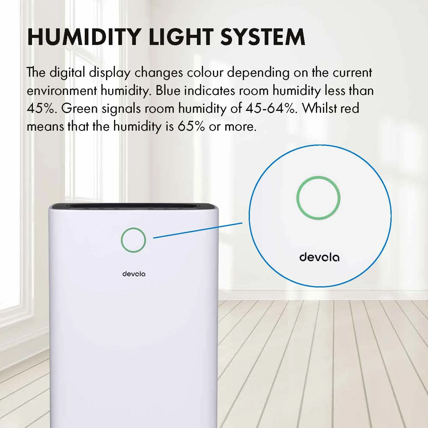 - When room humidity<45%, it will be shown blue (good).