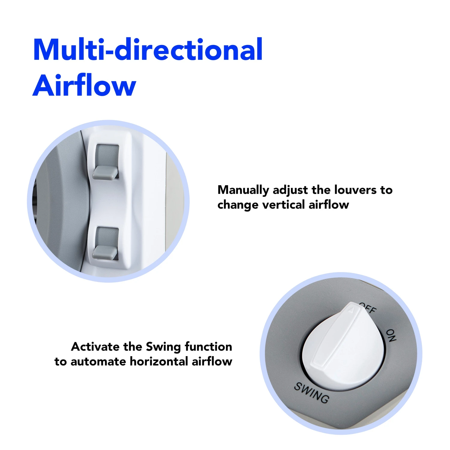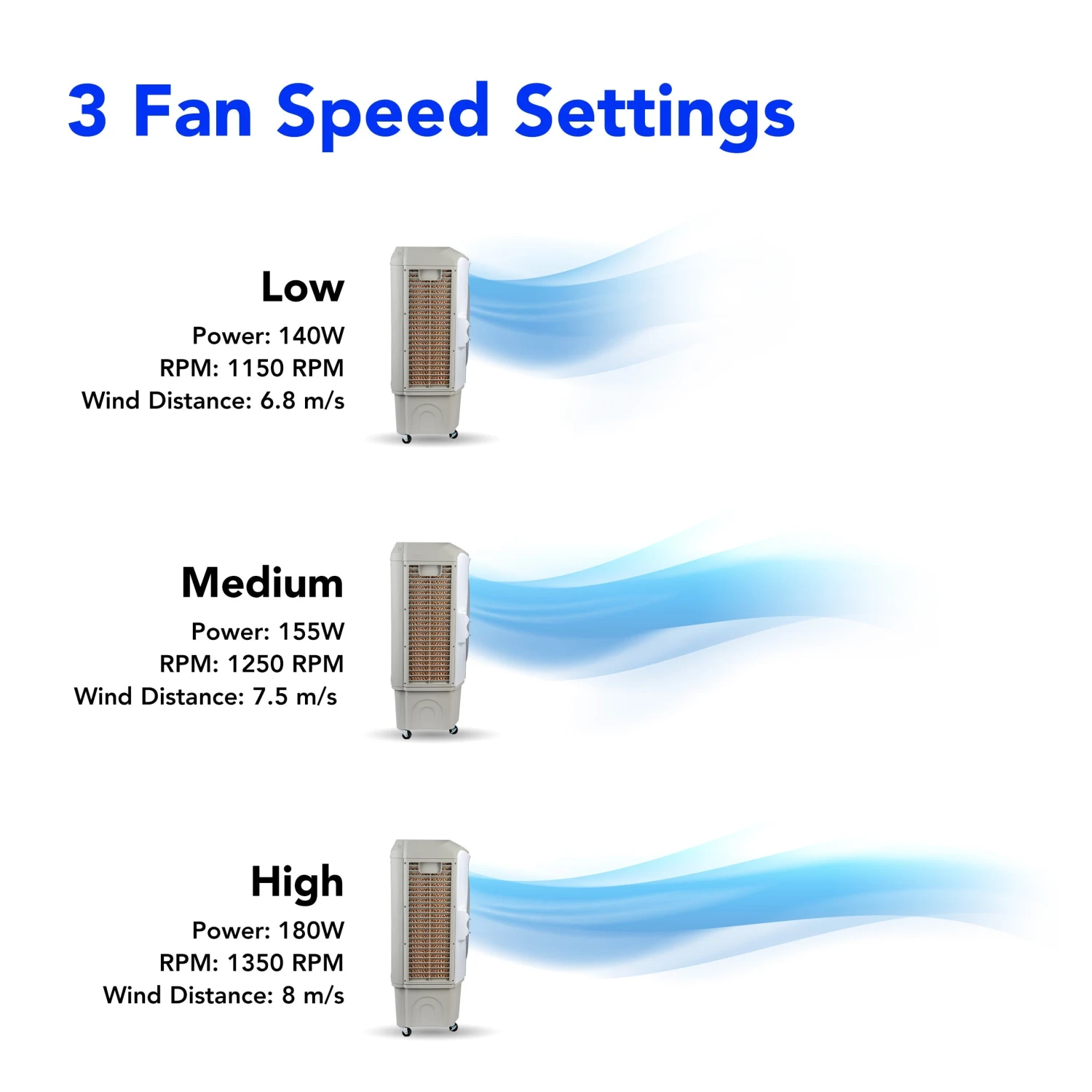 - FEATURES: 3 fan speeds, oscillating louvers, fan only mode, manual fill or continuous water feed.