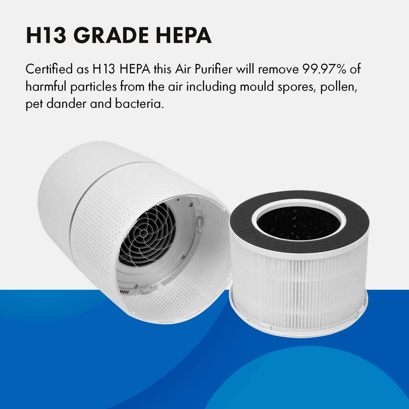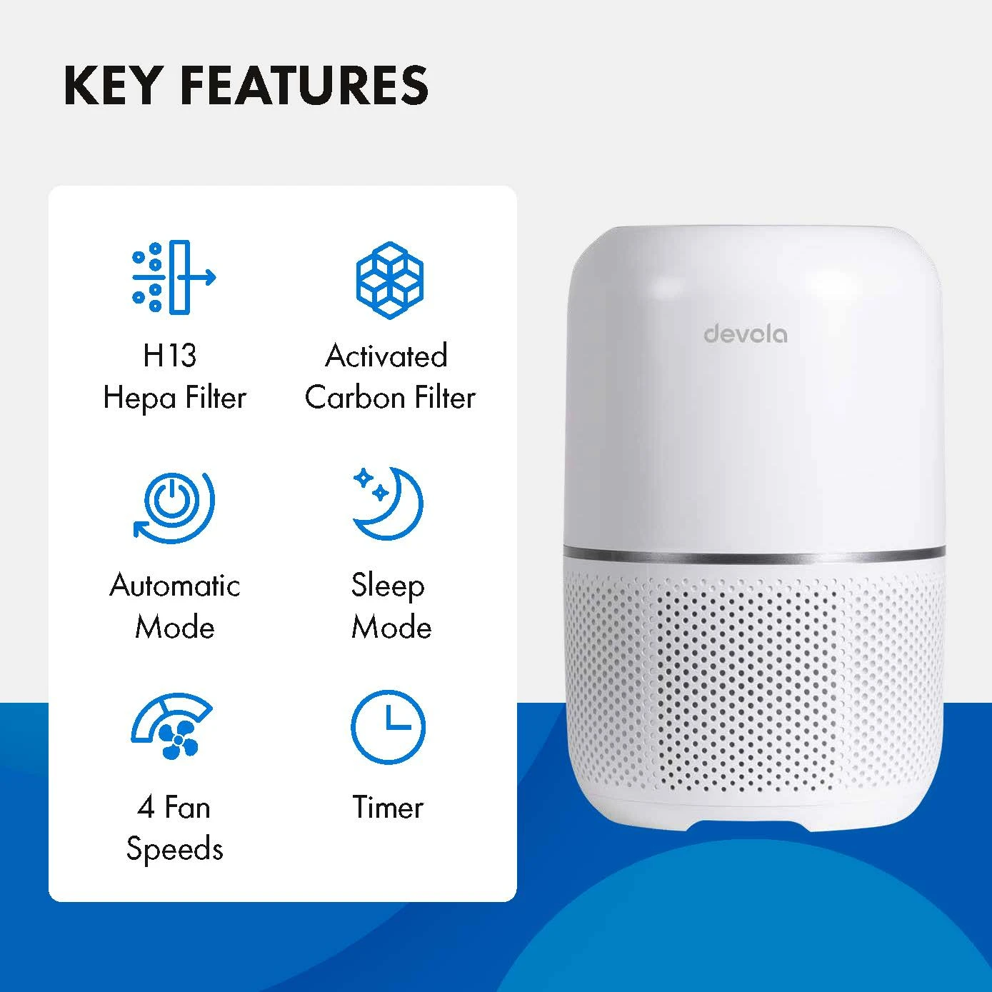 Introducing our Devola Air Purifier brand new for 2022, which is certified Grade 13 HEPA meaning it removes 99.97 of harmful particles from the air including pet dander, dust, pollen, mould spores and bacteria! Paired with the Activated Carbon filter which also removes odours and gases from the air including smoke, cooking smells and harmful gas pollutants, this Ozone Free Air Purifier is a super beneficial addition to your living room, kitchen, bedroom and anywhere in your house to provide cleaner air.