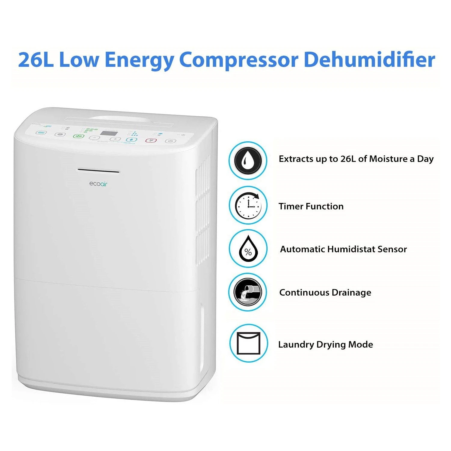 - The most energy efficient 26 Litres/day domestic dehumidifier in the market with Intelligent sensor that detects and displays humidity levels.