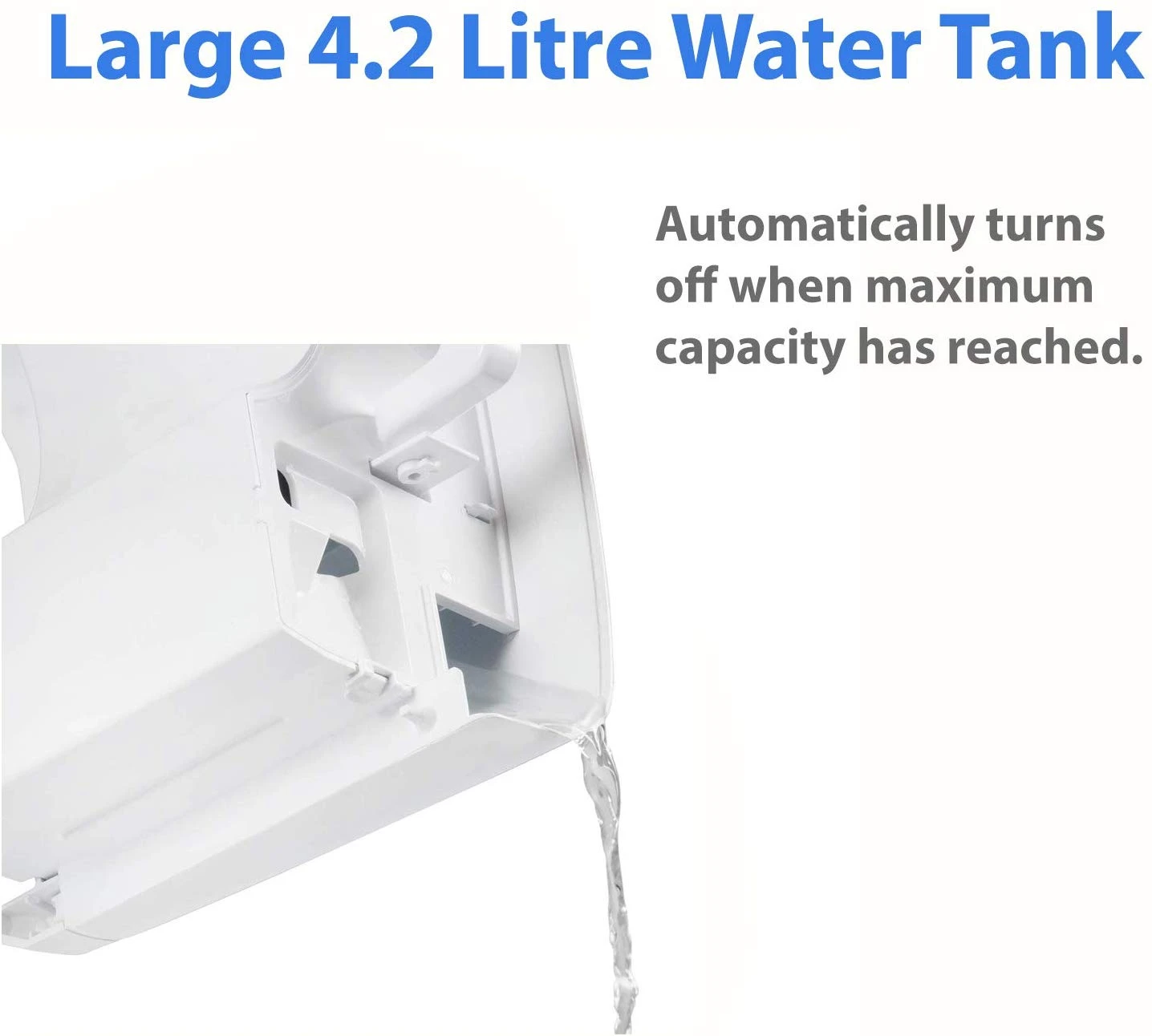 - 4.2L water tank with continuous drainage option, concealed easy glide castor wheels and washable air filter.
