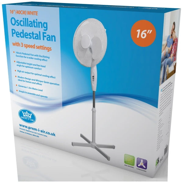 The Prem-I-Air 16″ (40 cm) Pedestal Fan features 3-speed settings, an oscillating function for wider distribution, and adjustable height and fan head angle to ensure that the cooling air really hits the spot.