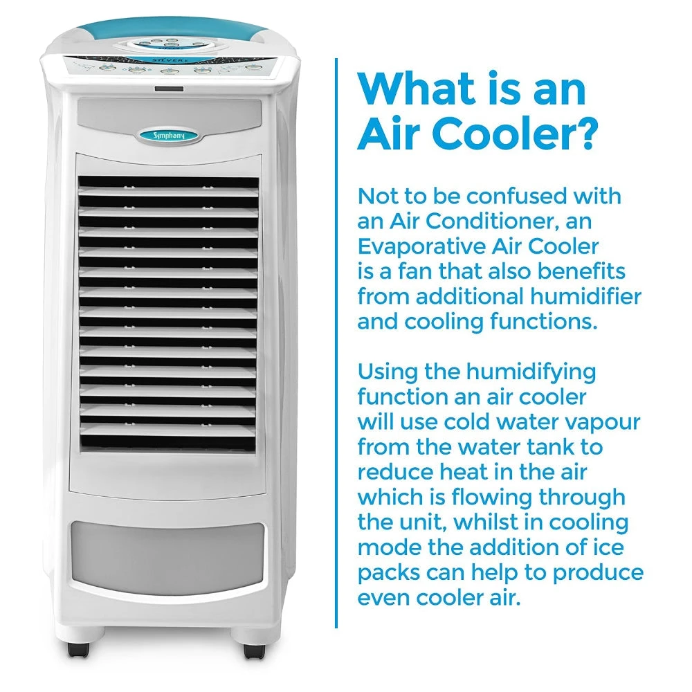 Stay cool and comfortable this summer with the Symphony SILVER-e Evaporative Air Cooler. The SILVER-e is a powerful air cooler, humidifier and air cleaner that does not require any venting or installation. It’s perfect for well ventilated small to medium sized rooms or as personal cooler. This portable air cooler delivers impressive spot cooling performance that works straight from the box.